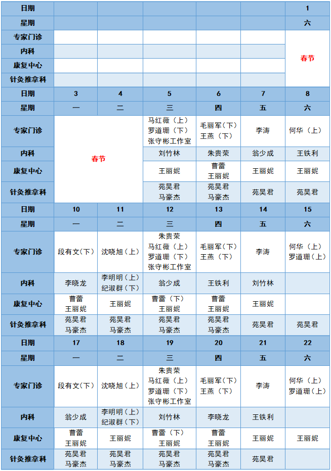 添福家2025年2月门诊出诊安排